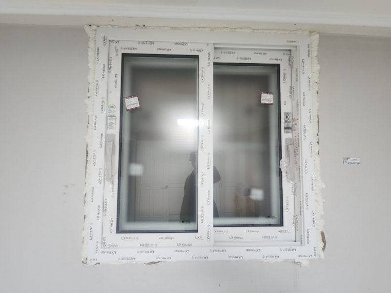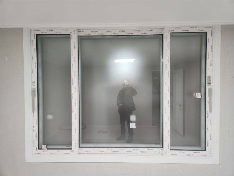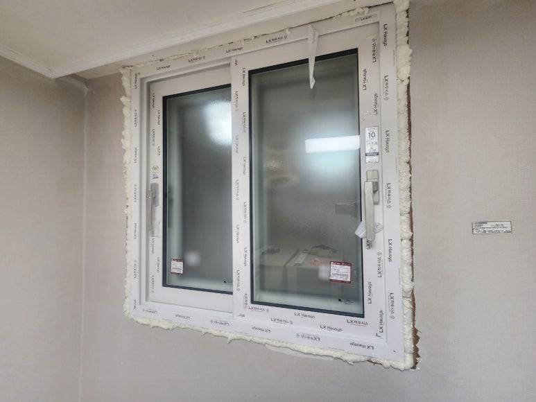 기존 인테리어에 걸려 창호가 내부로 들어오지 못해 벽과 평행하게 시공을 하였습니다.