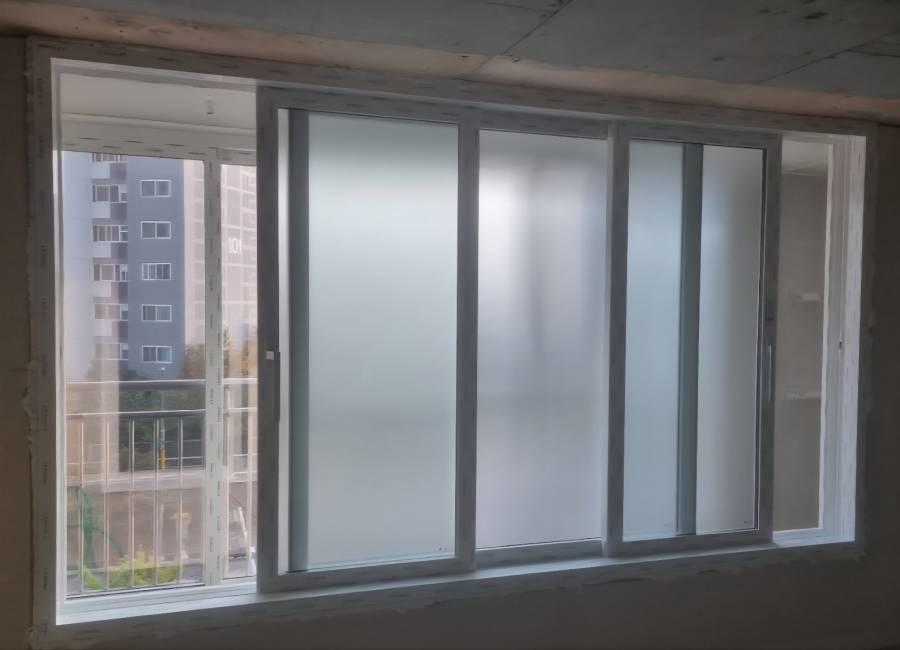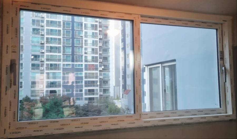 내부에는 불투명으로 외부에는 투명으로 시공했습니다.