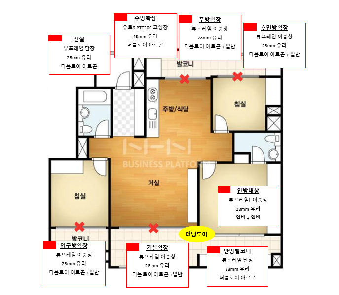 기존 미서기 창호를 → 유로9 시스템 고정창으로 변화를 주었습니다.