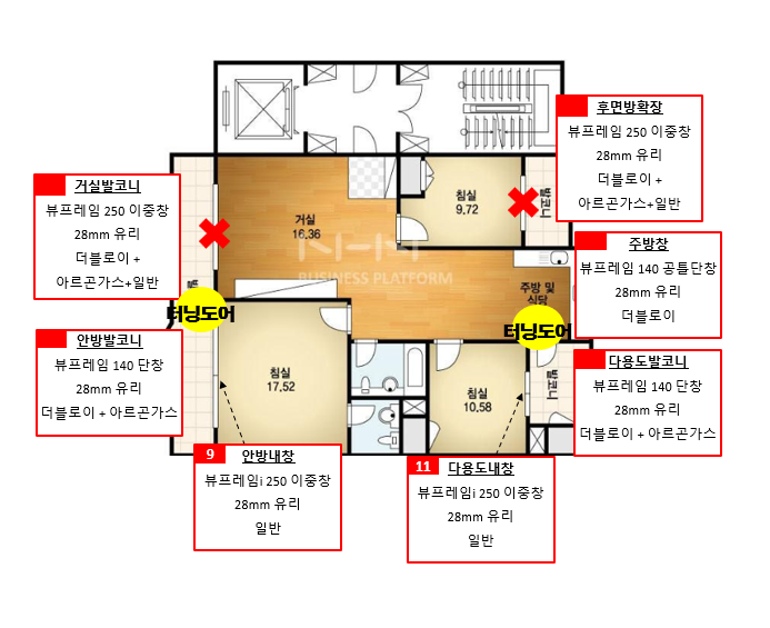 비확장 공간에는 뷰프레임 단창을 적용합니다.
