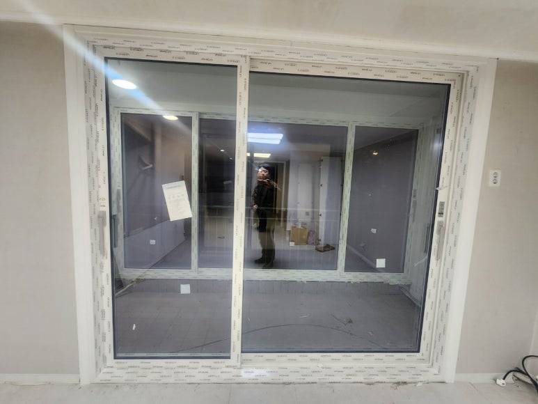 기존 인테리어에 걸려 창호가 내부로 들어오지 못해 벽과 평행하게 시공을 하였습니다.