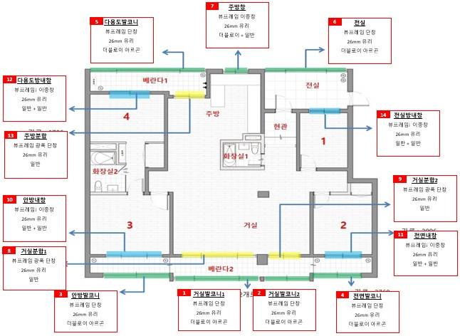 총 방이4개가 있는 구조로 각 방에는 이중창을 적용했습니다.