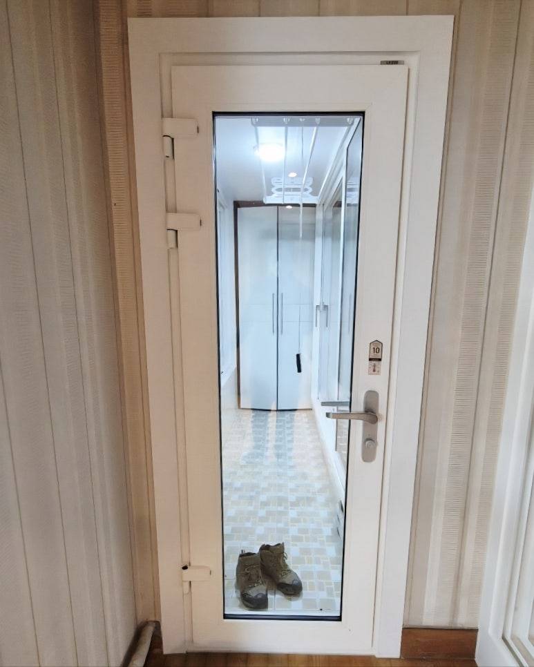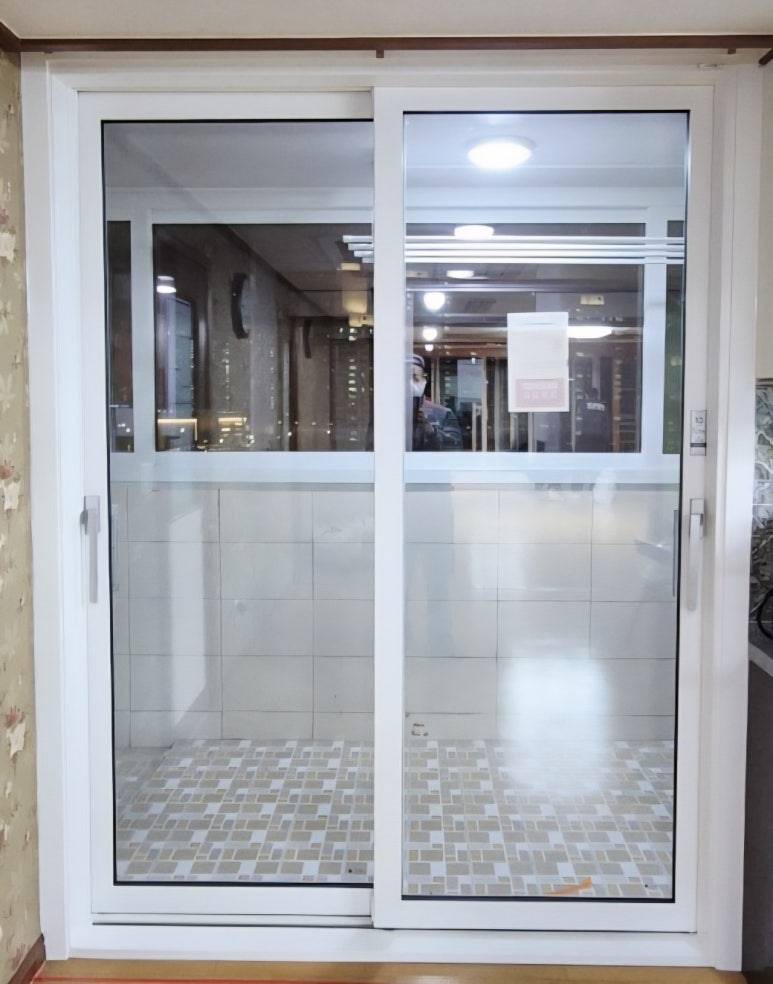 기존 인테리어로 인해 밖으로 밀수 없는 상황이라 안으로 당기는 문으로 시공했습니다.